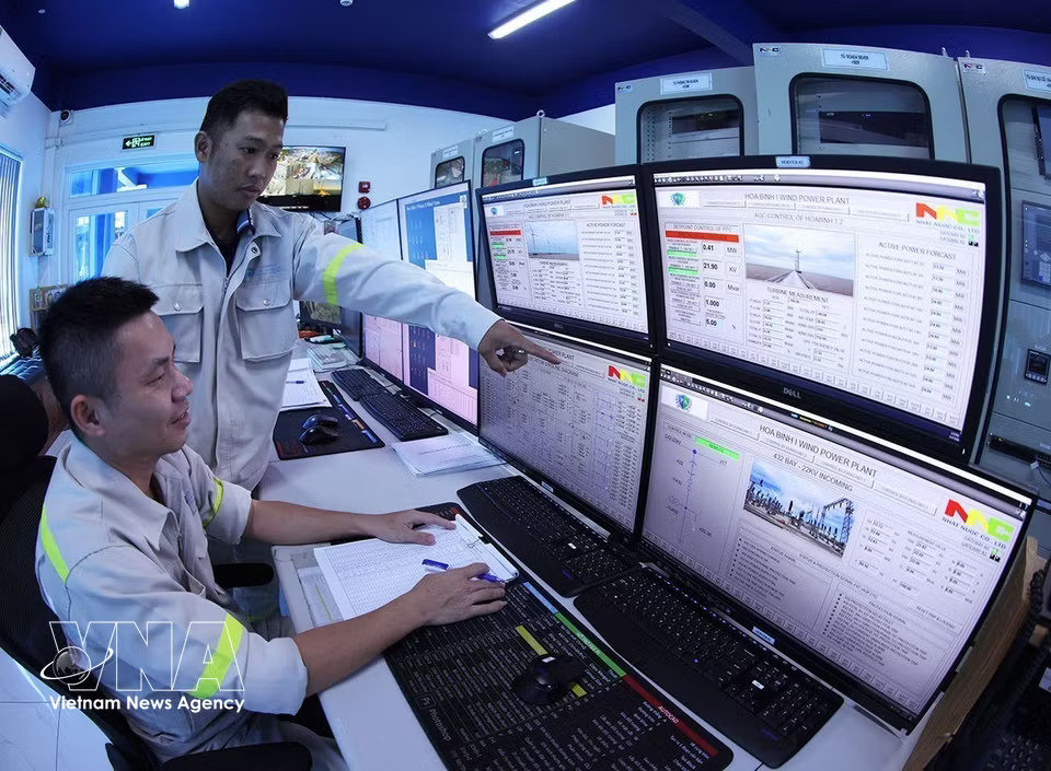 Operators ensure the stable operation of systems connected to the national grid at Hoa Binh 1 and 2 wind power plants in Vinh Hau commune, Ca Mau province. (Photo: Vu Sinh/VNA)