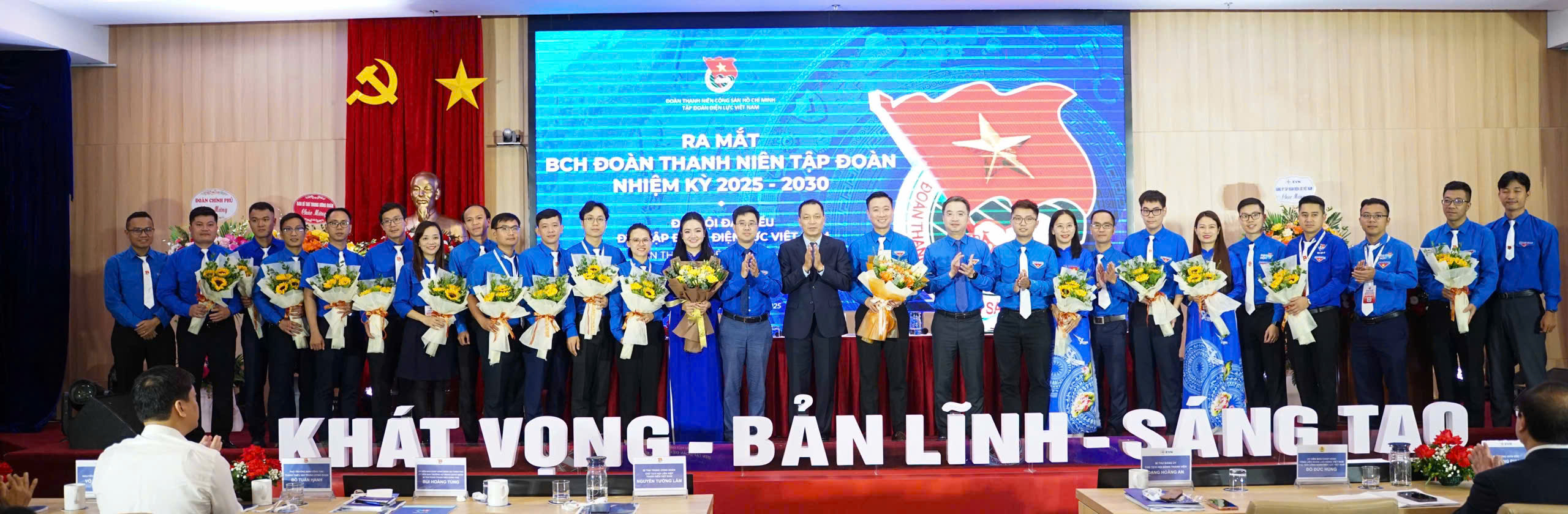 Comrade Dang Hoang An; Comrade Nguyen Tuong Lam - Secretary of Central Youth Union; Comrade Bui Hoang Tung - Secretary of Government Youth Union presenting flowers to congratulate Executive Committee of EVN Youth Union, Term V