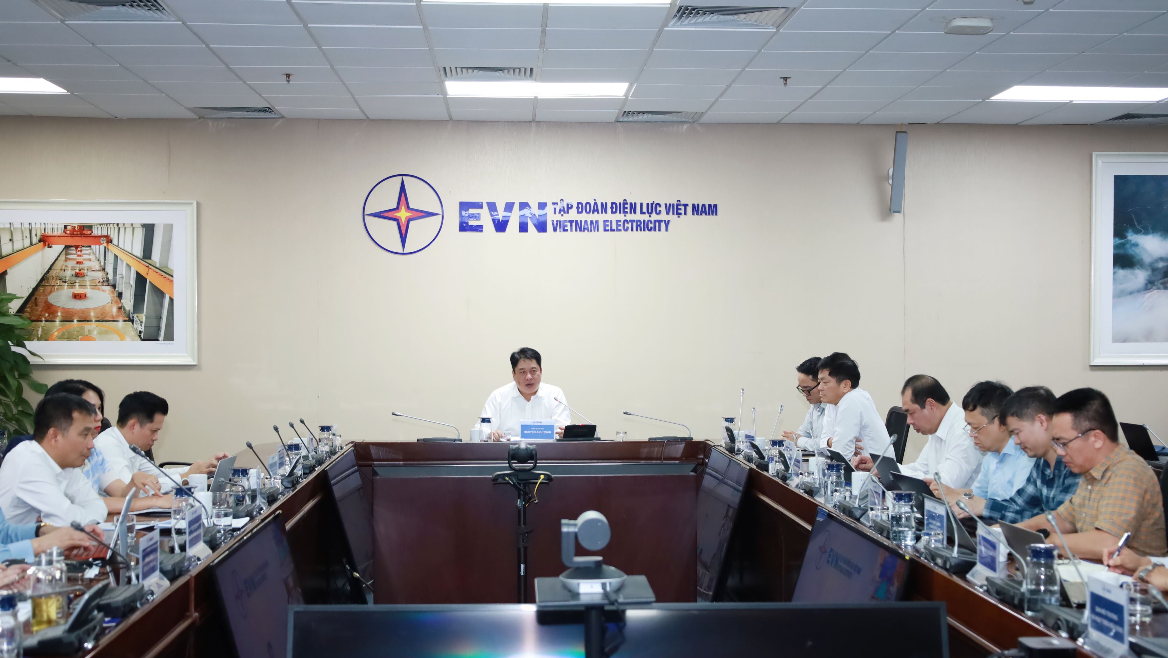 EVN President and CEO Nguyen Anh Tuan chairing working session at EVN's headquarters.