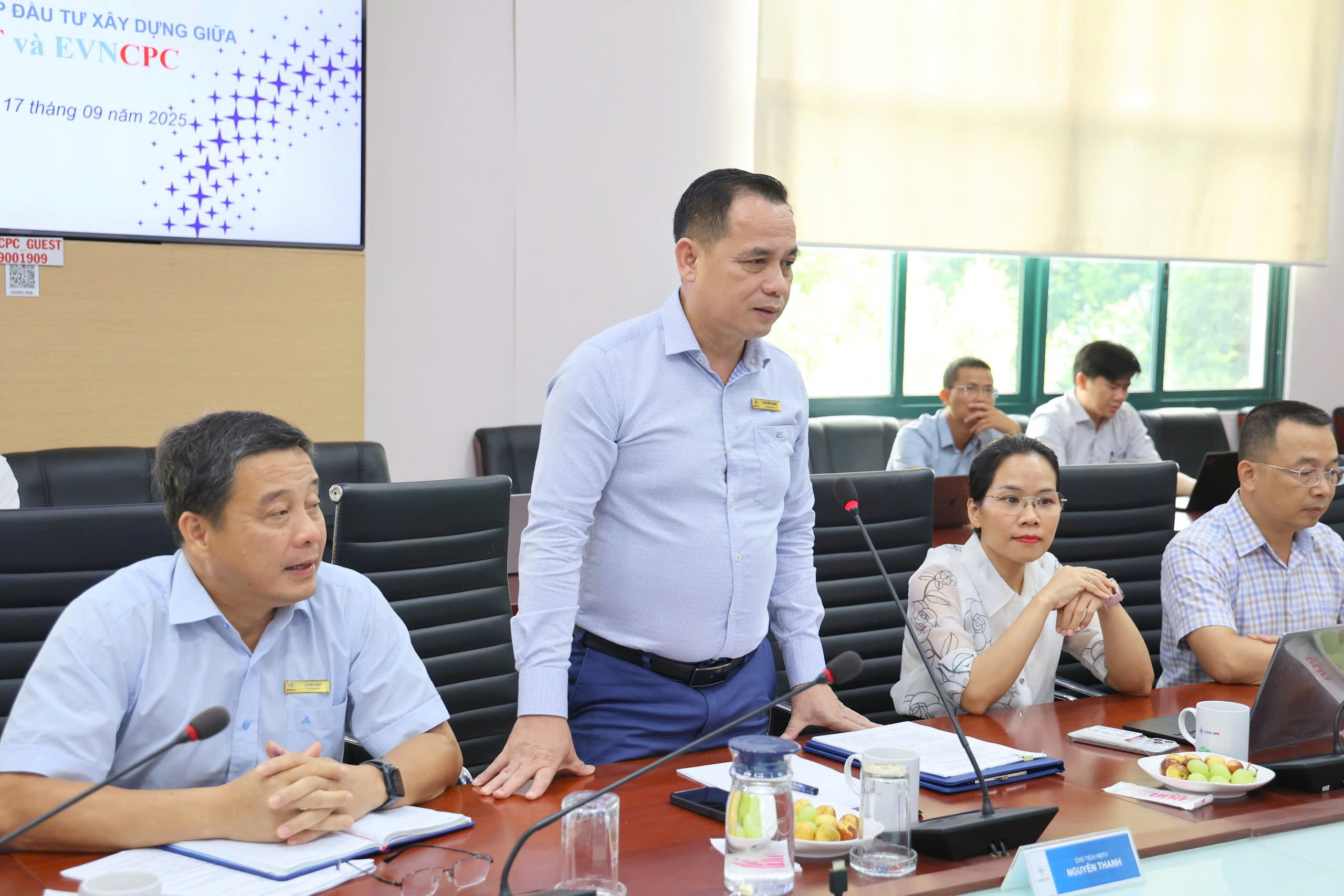 Attending the meeting, on behalf of EVNCPC, there included Mr. Nguyen Thanh - Chairman of the Board of Directors, Ms. Le Thi Phuong Cam - Member of the Board of Directors, Mr. Le Huu Danh - Deputy General Director, and leaders of the Boards.