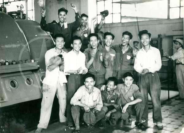 Workers of Thuong Ly Power Plant celebrated the achievement of completing the overhaul of Turbine No. 3 ten days ahead of schedule (Hai Phong, 1965). Photo credit: Tran Nguyen Hoi