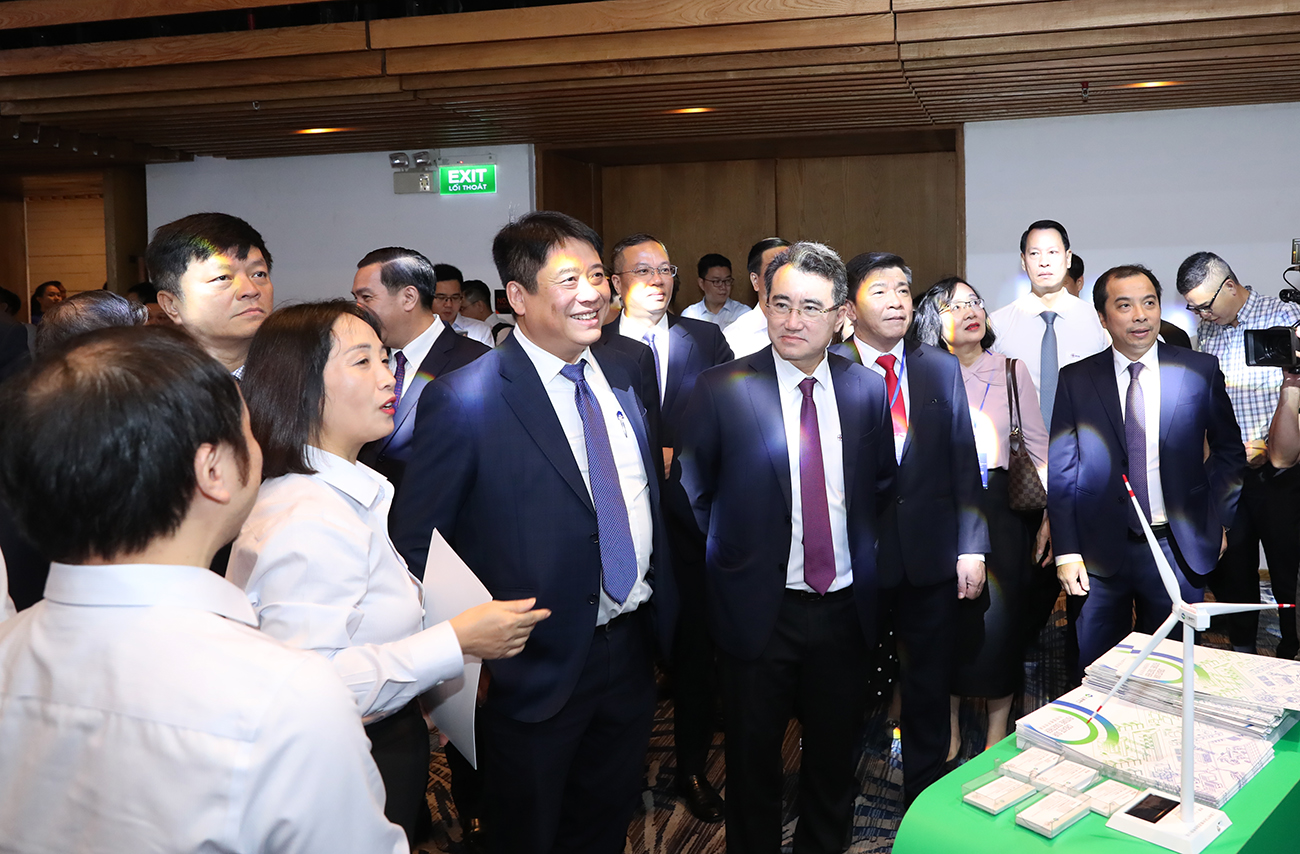 EVN President and CEO Nguyen Anh Tuan (third from left, front row) and VEEA Chairman Dang Huy Cuong (fourth from left, front row) visiting exhibition booths