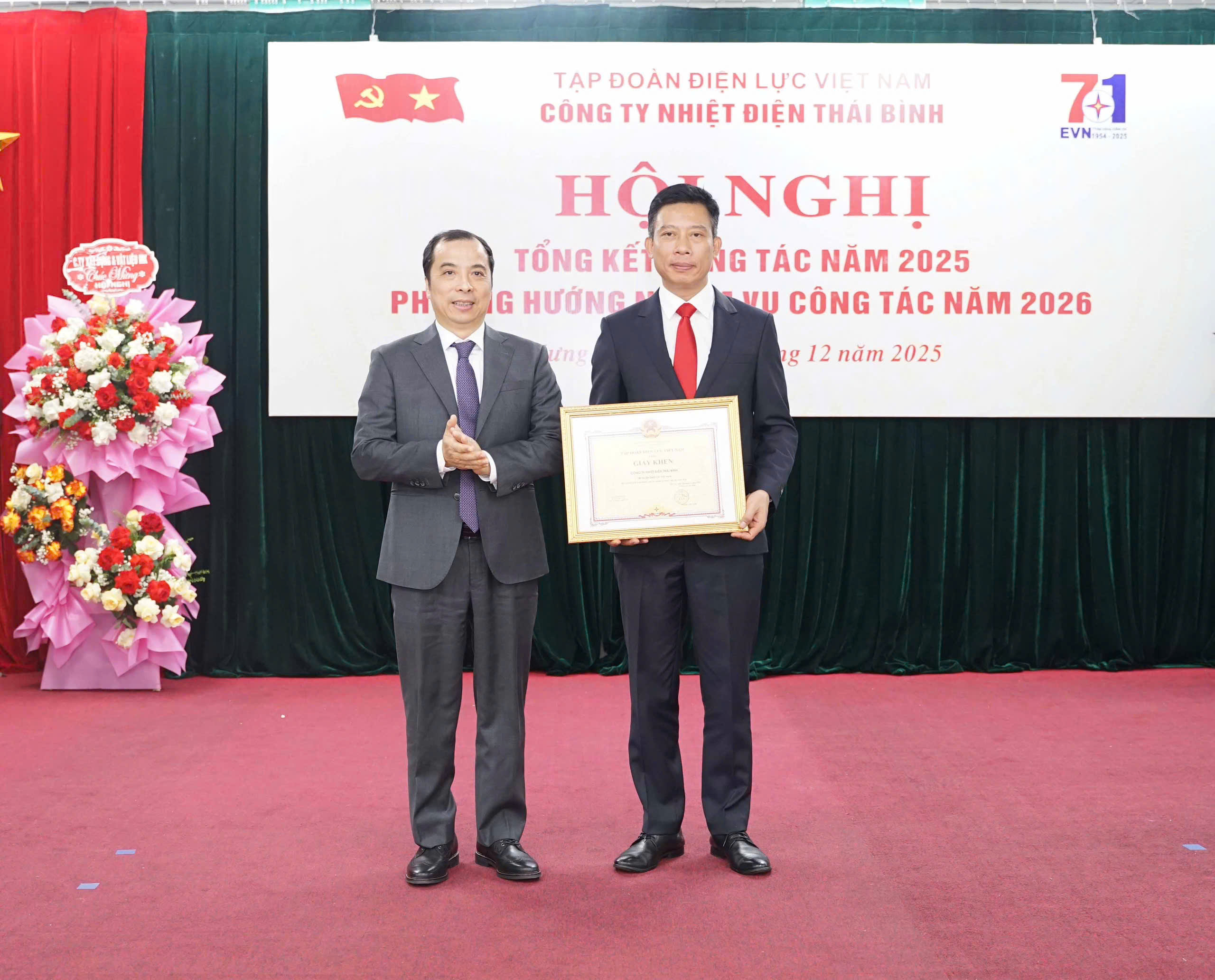 Mr. Ngo Son Hai, Member of Party Committee, EVN Vice President, presenting EVN Certificates of Merit to Thai Binh Thermal Power Company, collective that successfully completed its tasks in 2025