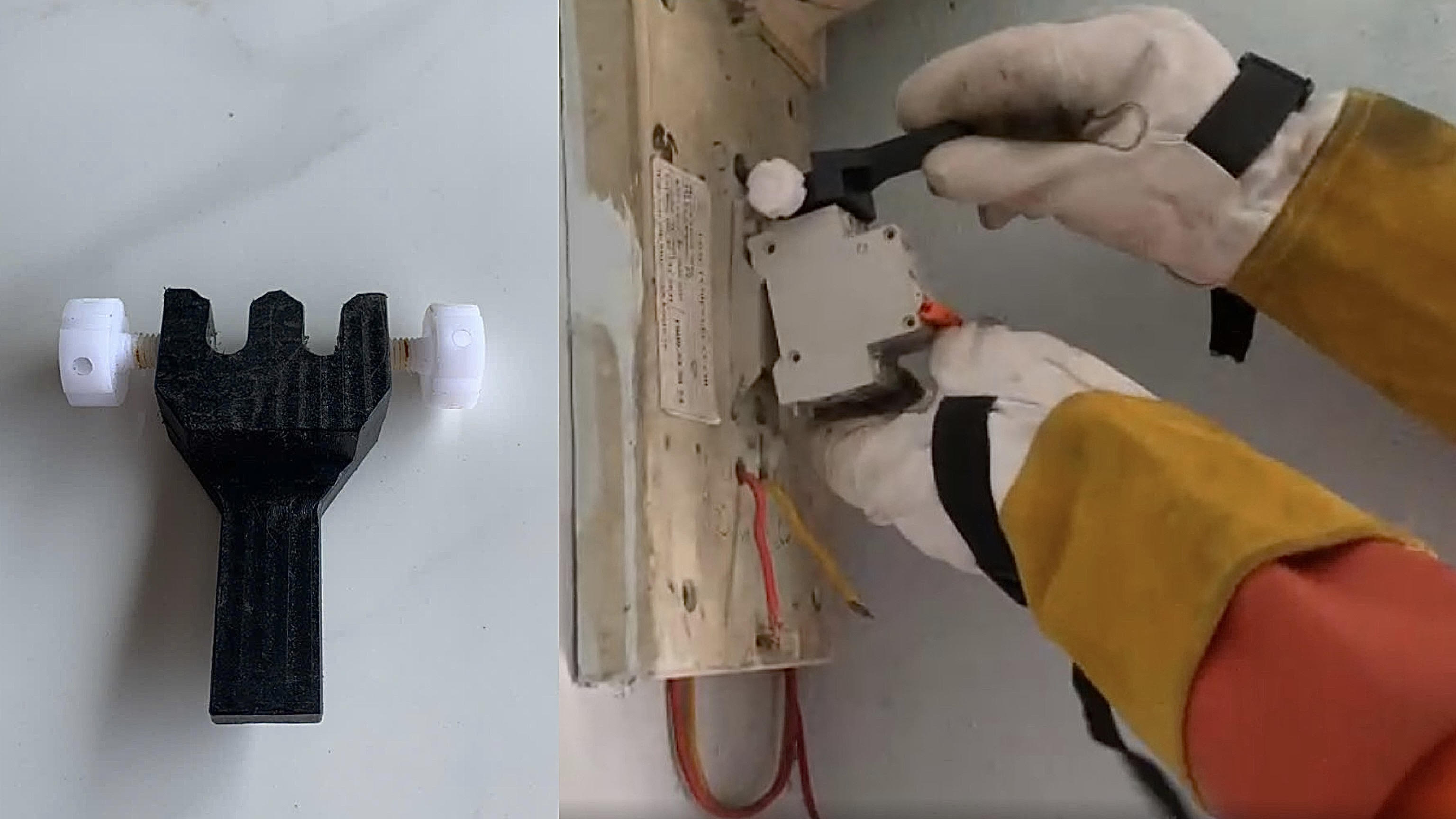 Tool for positioning wire ends when replacing damaged circuit breakers helps shorten operation time to one-third of what it used to be and ensures almost 100% safety for electrical workers.